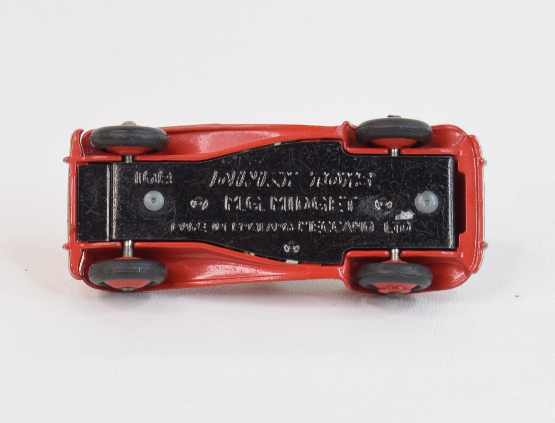 This U.S export issue M.G comes in gleaming red with tan interior, red ridged hubs, black steering wheel, well shaped treaded tyres, intact windscreen, '108' baseplate, excellent silver trim & shiny axles. Virtually mint