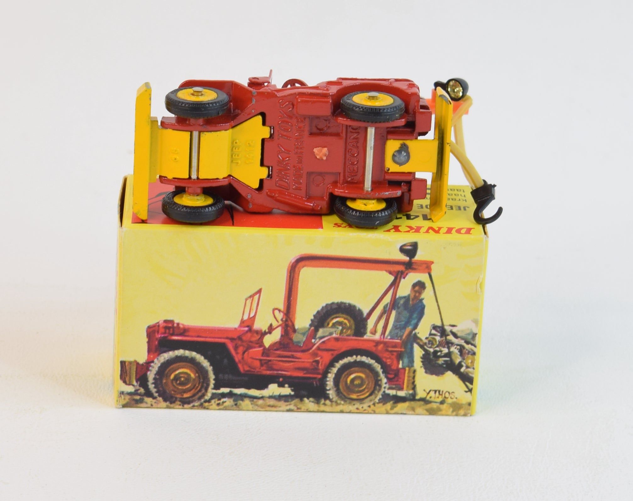 This Jeep comes in red & yellow. Silver headlights, yellow concave hubs, intact original windscreen surround, well shaped tyres, intact decals, jib & hook assembly all intact and correct, clean base & not a hint of rust to the axles. Virtually mint