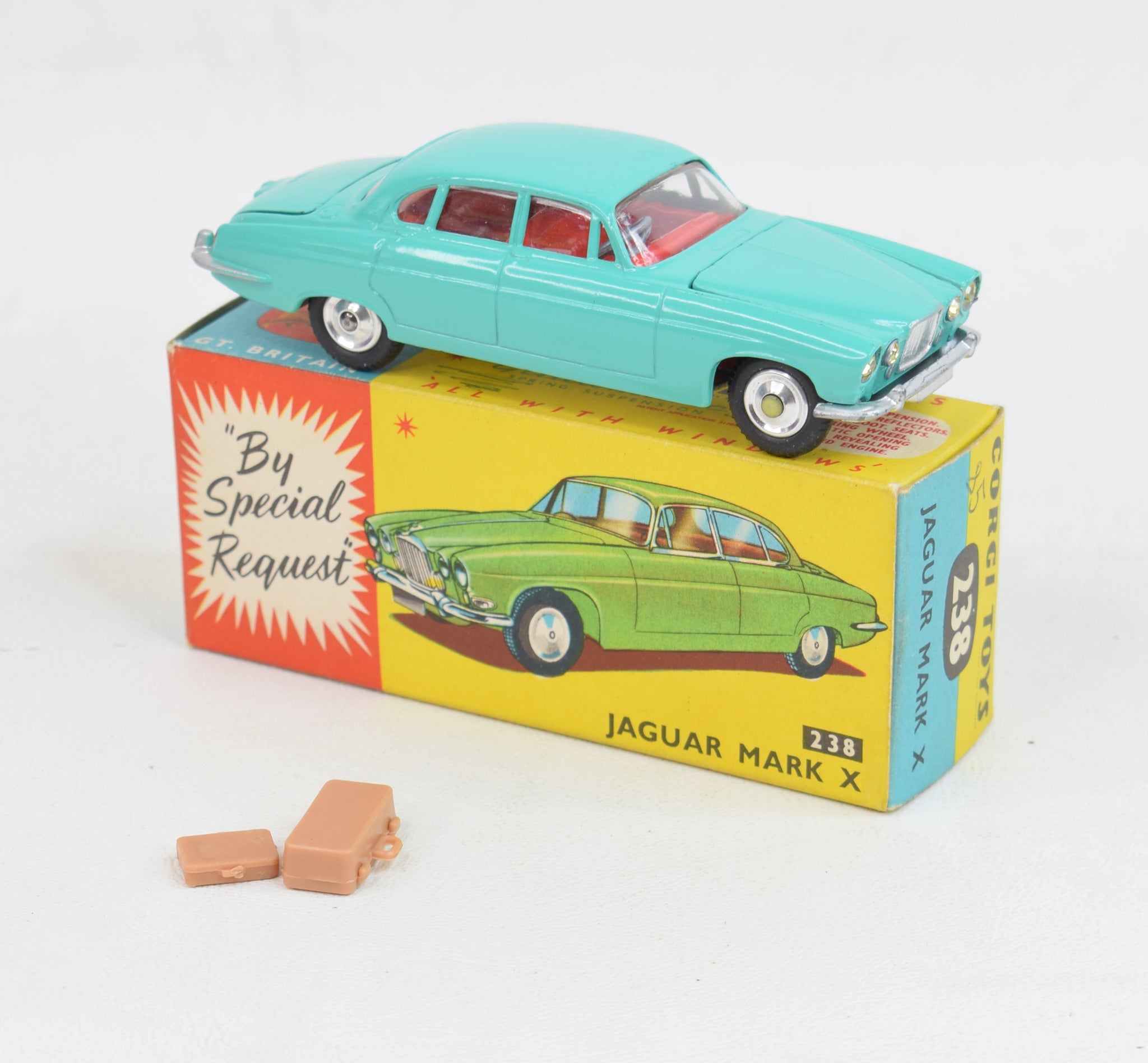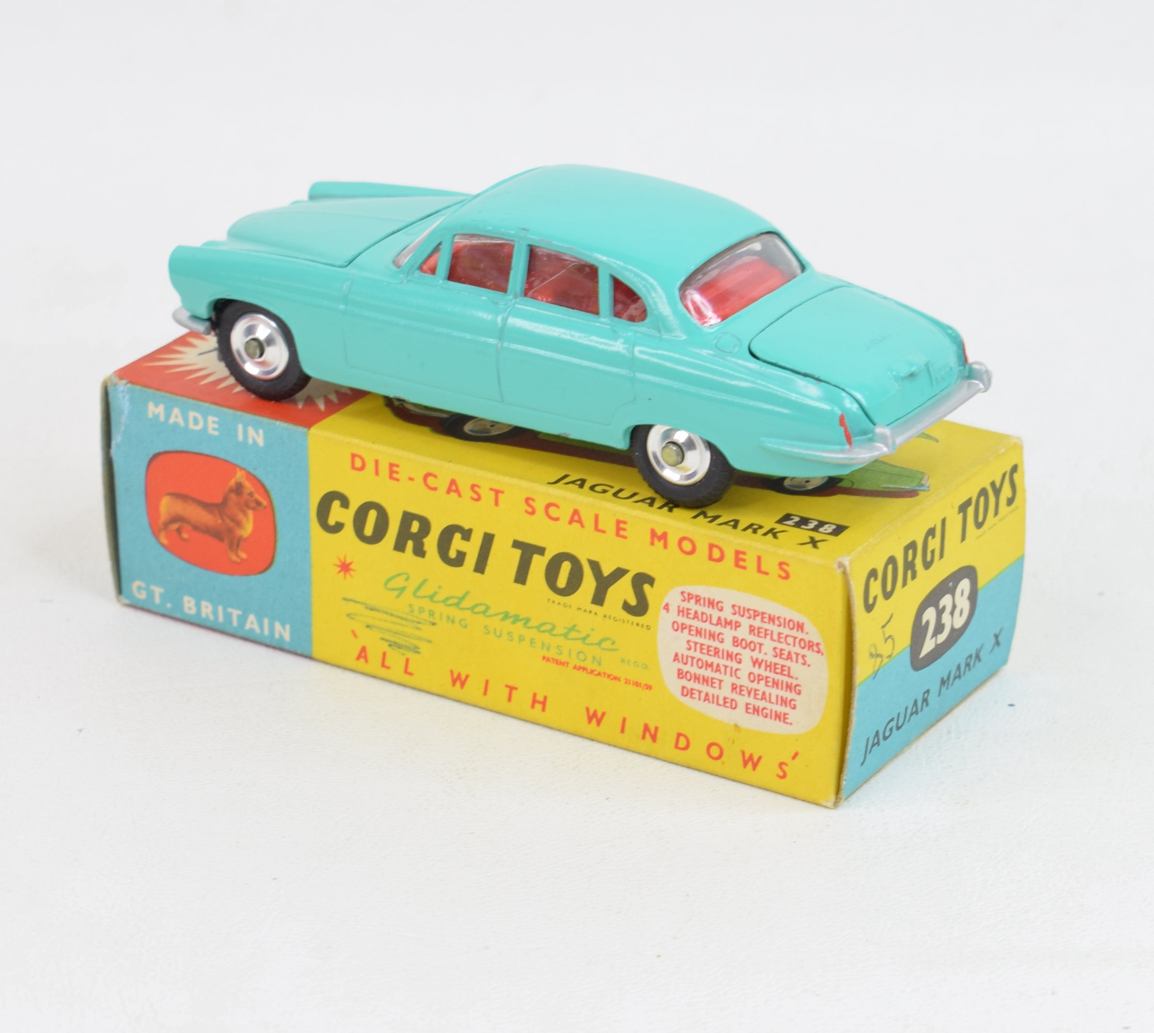 This 238 comes in sea green with red interior, shiny spun hubs, well shaped treaded tyres, bright baseplate, 4 jewelled headlights, silver trim, bright clear glazing & not a hint of rust to the axles. Virtually mint