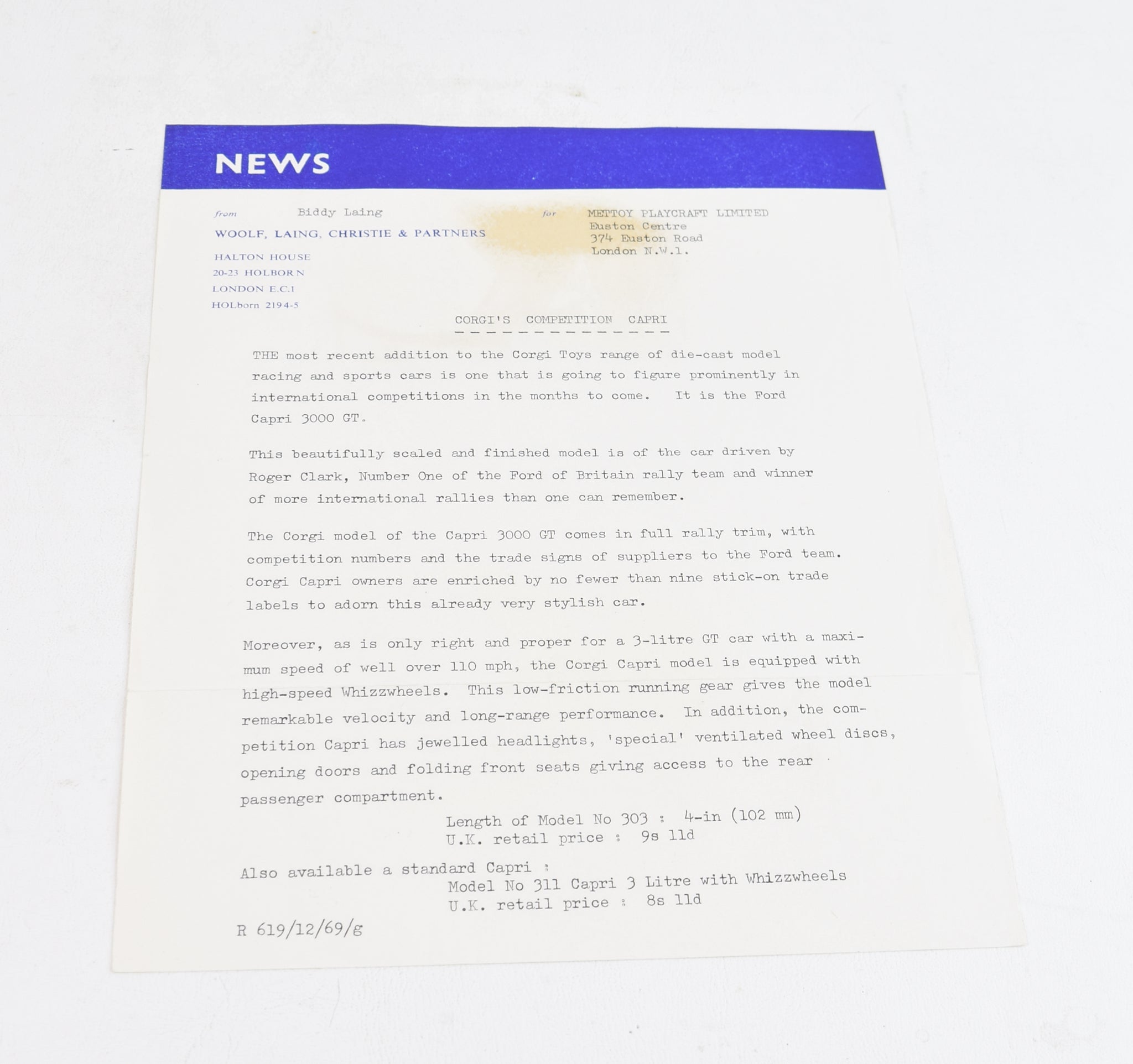 Corgi Press Release from the P.R. Company Woolf, Laing, Christie & Partners. Dated from December 1969. Also included is the correct black and white photograph.