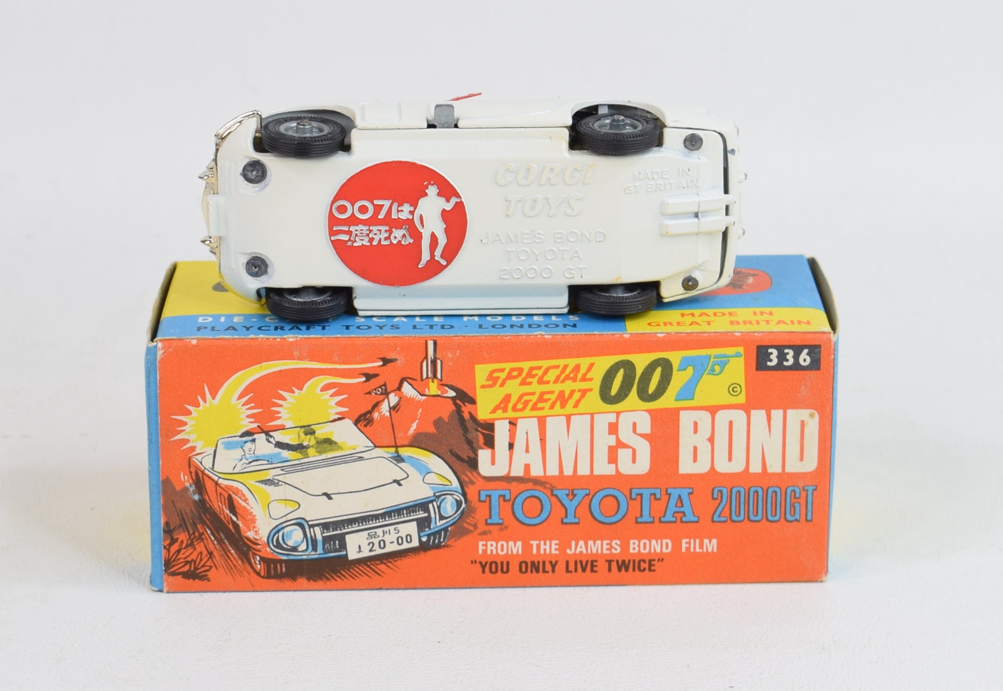 This 336 'You only think twice' Toyota 2000GT comes in a gleaming white finish, black interior, both figures, boot feature is fully operational & closes correctly, intact number plates, six jewelled lights which includes four to the rear & two to the front, detailed wire wheels, well shaped treaded tyres, red aerial, chrome trim, clean baseplate, intact windscreen, intact functional suspension & not a hint of rust to the axles. Virtually mint