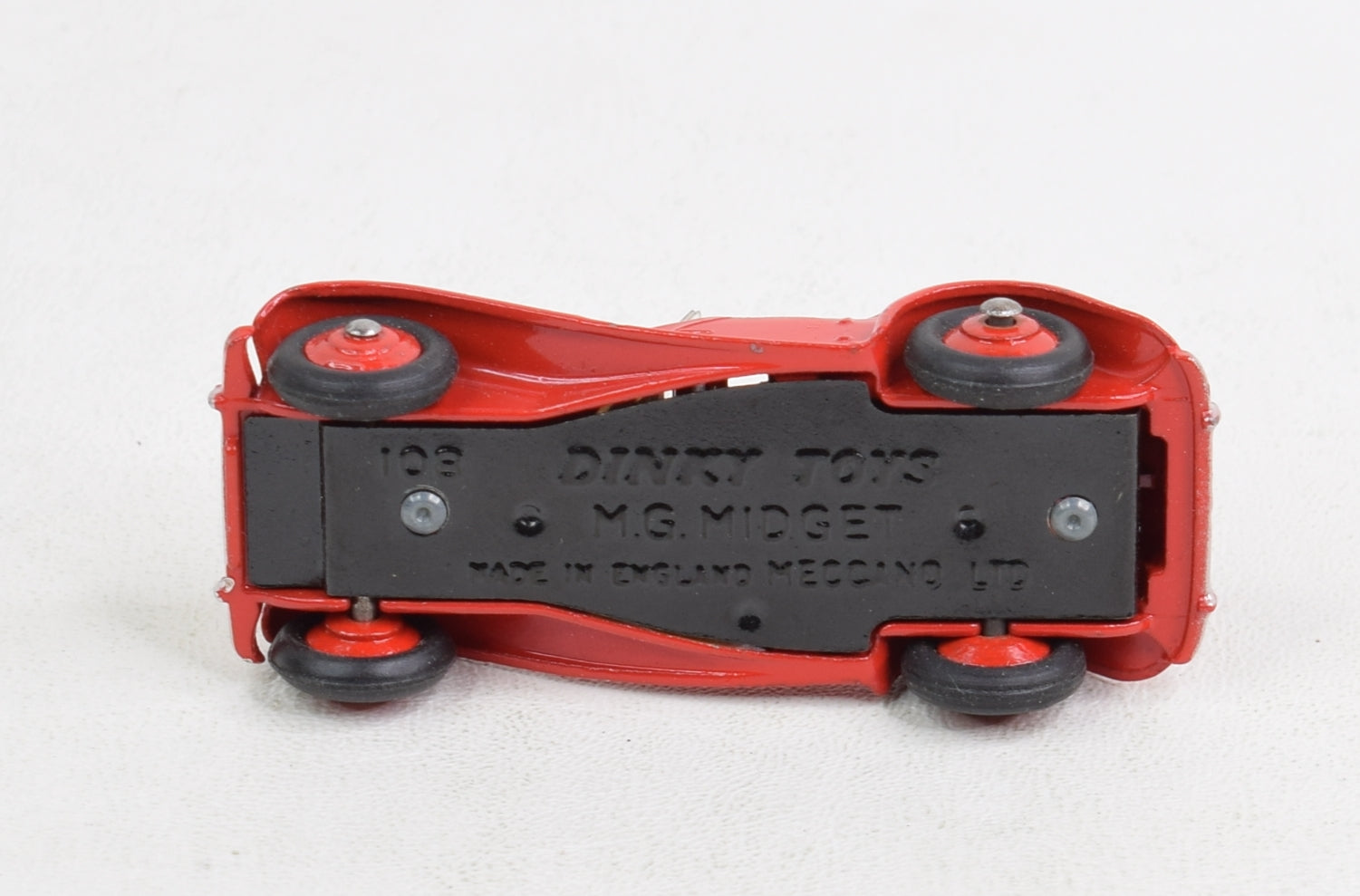 This U.S export issue M.G comes in gleaming red with tan interior. Red ridged hubs, black steering wheel, well shaped treaded tyres, intact windscreen, '108' baseplate, excellent silver trim & shiny axles. Virtually mint