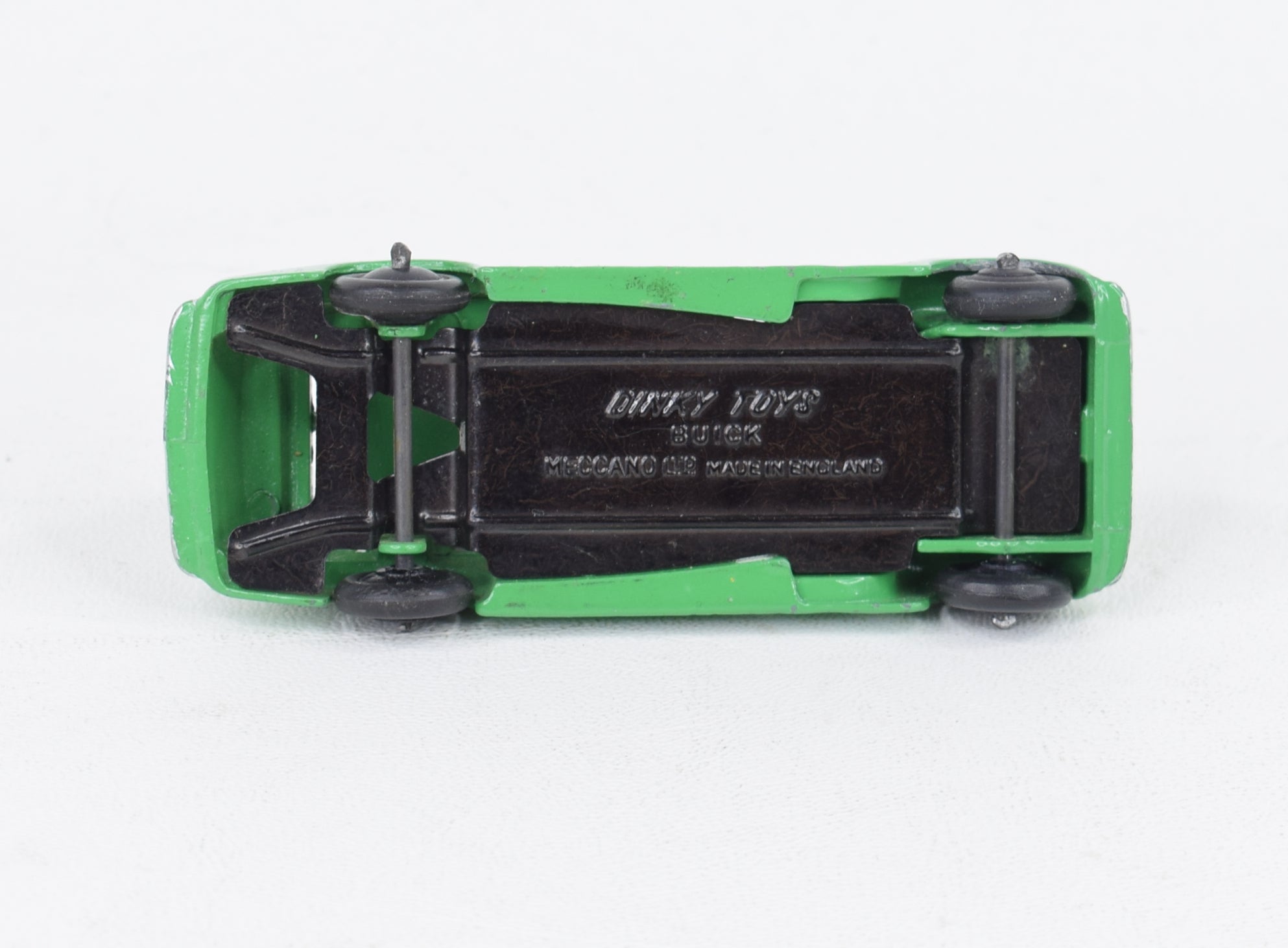 This 39d Buick comes in mid green & black ridged hubs, well shaped smooth tyres, baseplate with cut-out & exposed rear axle, silver trim & shiny axles. Very near mint