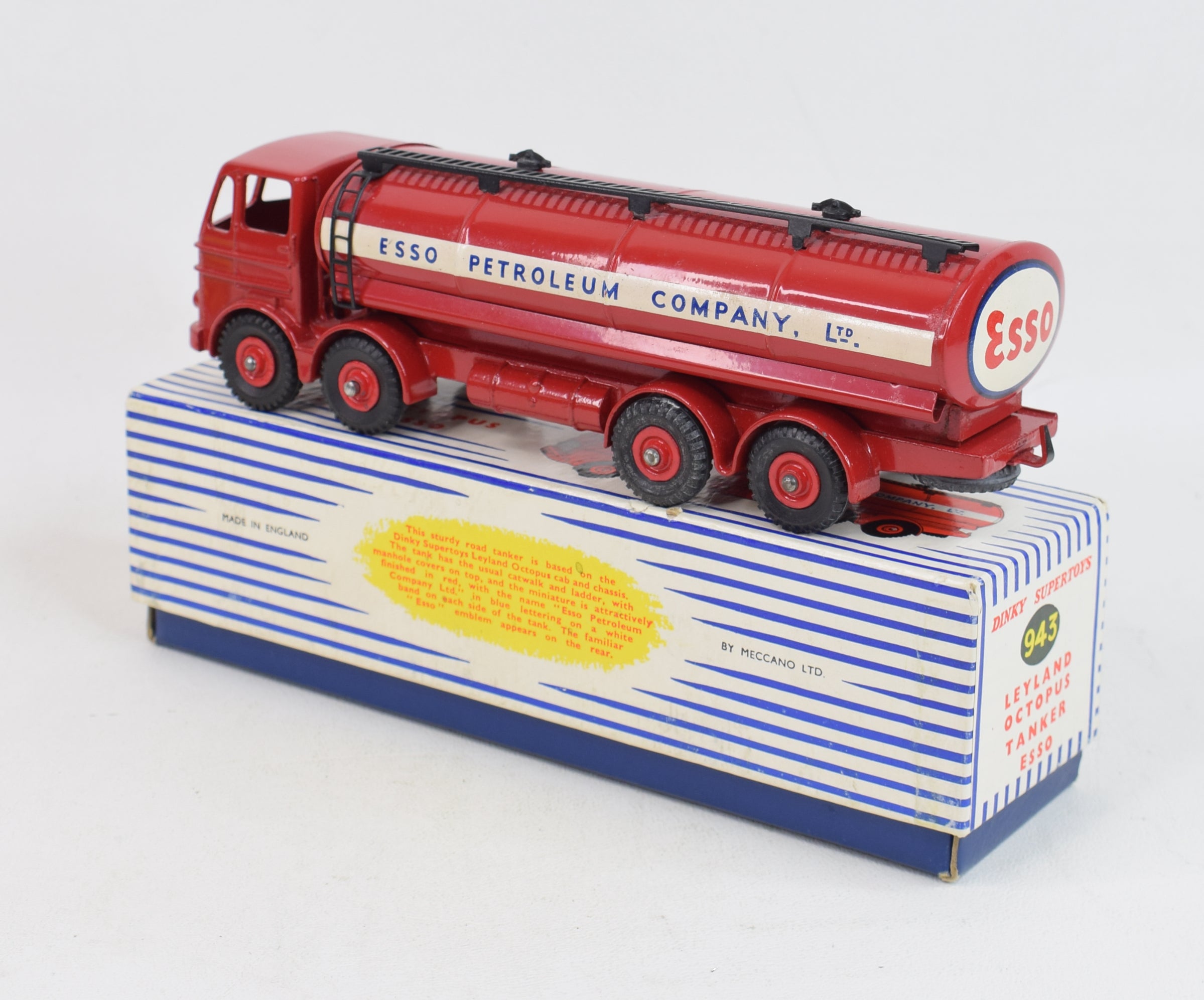 This Leyland Octopus 'Esso' Tanker is coming in rich gleaming red with red supertoy hubs. Black filler caps & ladder, large painted tow hook, well shaped supertoy tyres, lovely decals, superb silver trim & not a hint of rust to the axles. Virtually mint