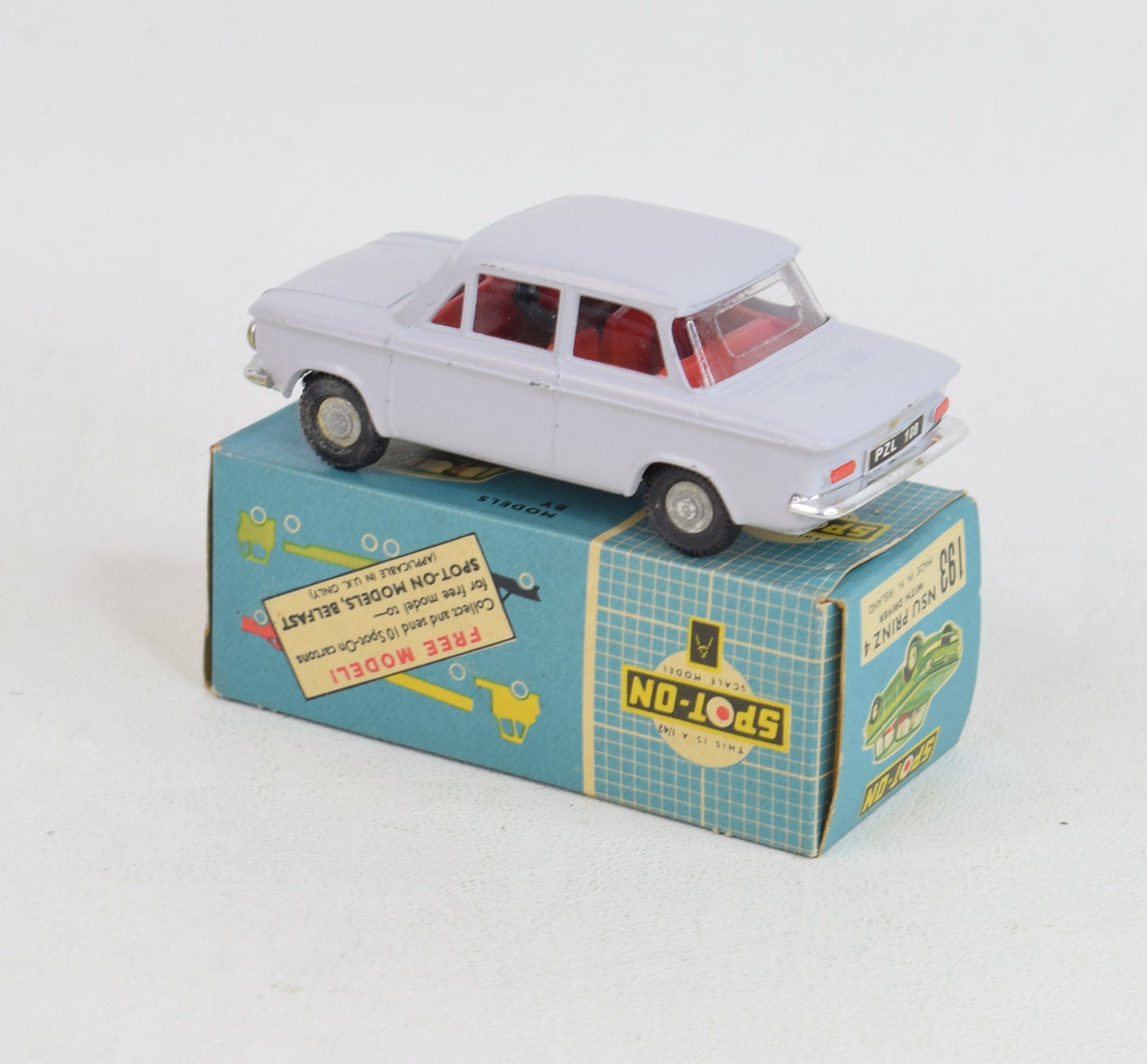 This 193 Prinz comes in light grey with red interior, black steering wheel, W3 hubs, bright light grey baseplate, intact number plate decals, well shaped treaded tyres, brown driver, fully operating suspension & bright clear glazing.