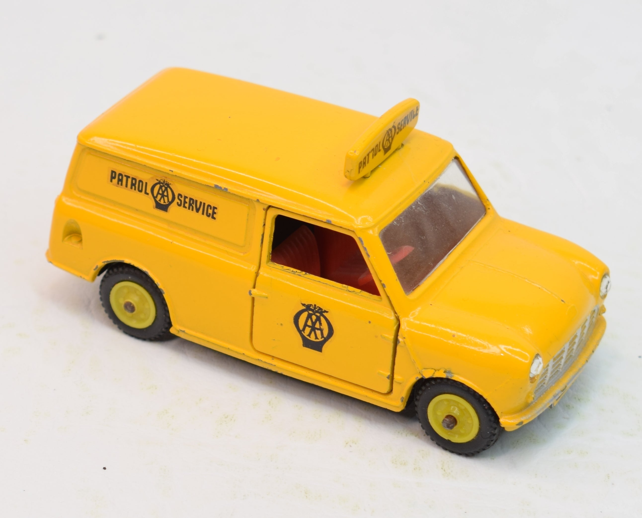 This very rare A.A Mini Van comes in yellow with yellow hubs. Well shaped tyres, very nice decals, roof casting detail present, shiny baseplate, opening side/rear doors with red interior, red steering wheel, silver trim & clear glazing. Odd minor mark